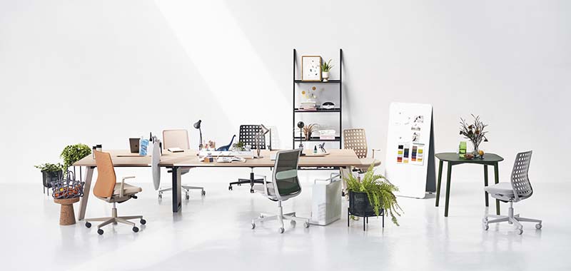 メッシュ・クッション・樹脂シェルの3タイプと、ナチュラルトーンがベースの心地のよいカラーから、空間や好みに合わせて組み合わせをお選びいただけます。