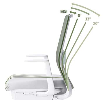 ロッキングの角度範囲を「アップライト固定(0°)、6°、13°、20°」の4段階から選択が可能です。ロッキング角度固定式に比べて、より効果的に姿勢変化をサポートします。