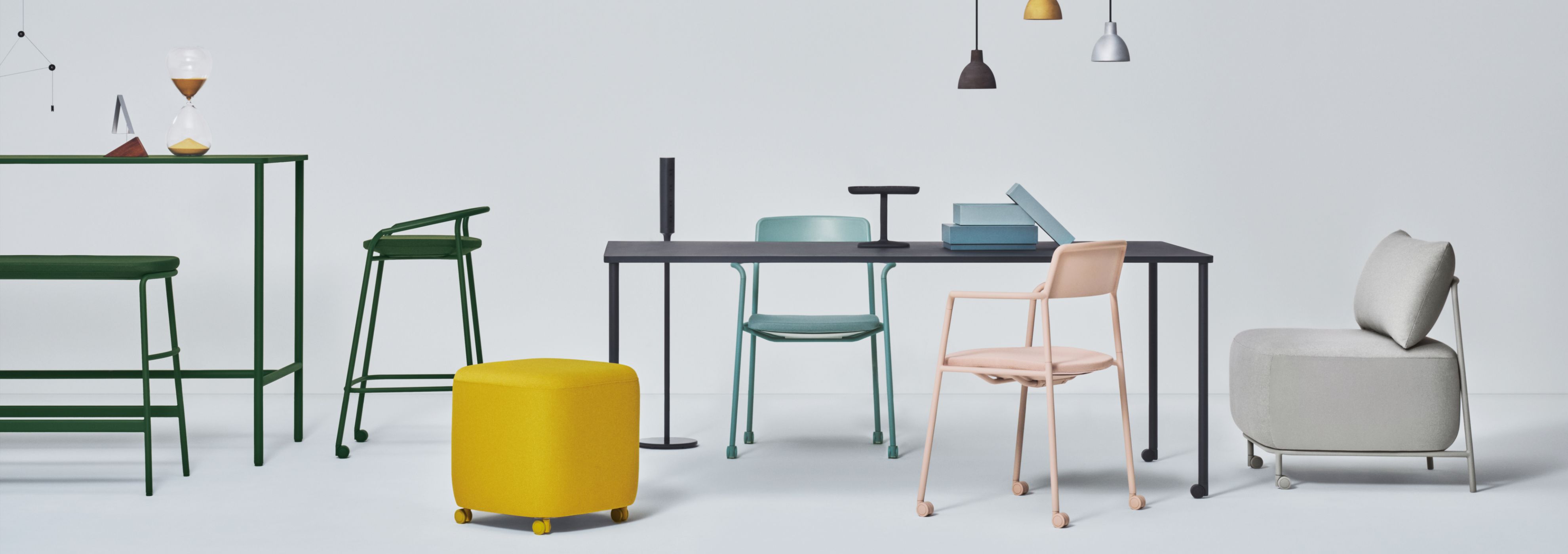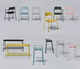 肘付きチェアーはスタッキングすることができ、ハイスツールの背フレームはさっと握りやすく立ち座りもしやすいシンプルなデザインです。