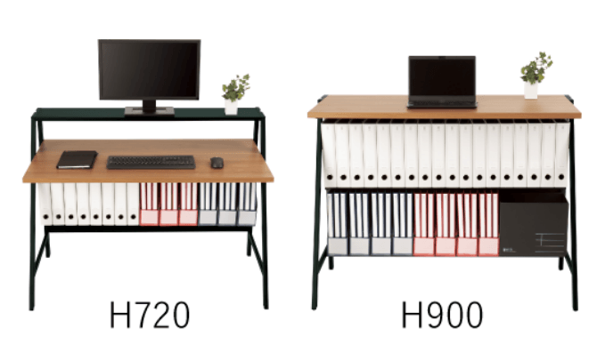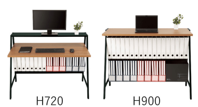 耐荷重40kgの棚には、保管書類やモニターなどを設置でき、作業性の良い環境を実現します。2つの天板の高さ(H720/900)をご用意しています。