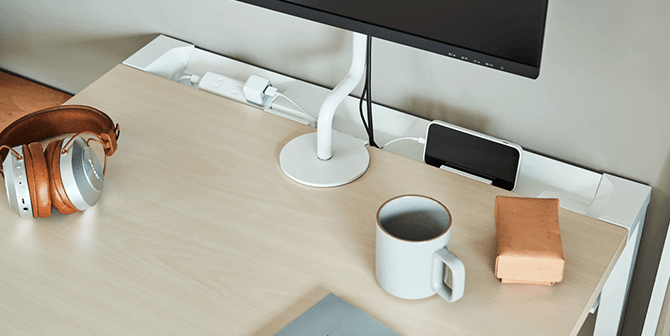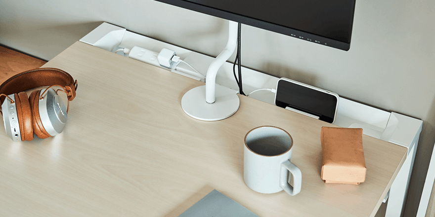 電源にアクセスしやすいオープンな机上配線トレーで、ケーブル類をすっきりと収納できます。