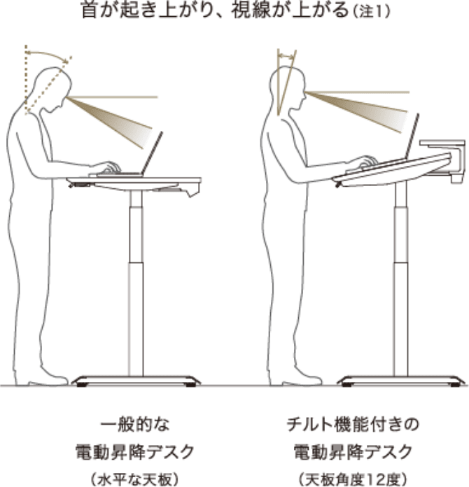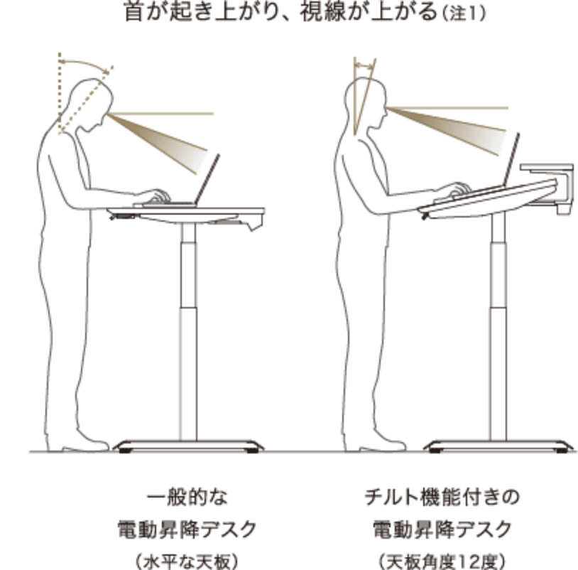 チルト機能付きタイプ(チルトテーブル)では、天板に角度をつけることで、首の前傾姿勢が垂直に近くなり、視線角度も改善。水平な天板で作業するときと比べて首の筋にかかる負担が軽くなるので、首や肩がコリやすい方にもおすすめです。