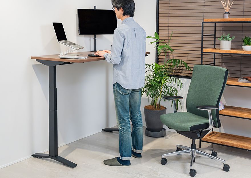 座りすぎによる体への負担を考え、電動で高さを上げることで立った姿勢でも仕事ができる昇降式。高さだけでなく天板の傾斜角度も変えられるので、視線を上げてより正しい姿勢で作業ができます。