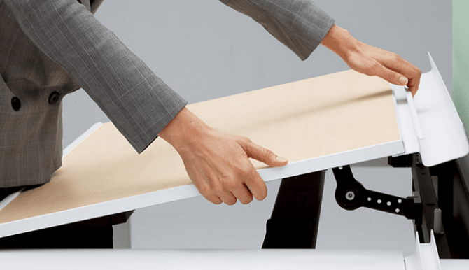 天板を両手でゆっくりと引き上げるだけで、最大12度までお好みの角度に調整できます。頭や視線が下がりがちになる通常の水平な天板と比べ、画面が上がることで視線も上がって疲れ目を軽減。目線を上げるだけのノートPCスタンドとは違い腕もデスクに預けられるので、手首にも負担をかけません。