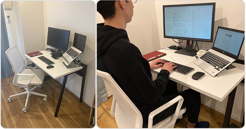 2020年4月ごろの緊急事態宣言を機に在宅ワークが始まり、仕事のためにダイニングテーブルとチェアのセットを急遽揃えました。狭いダイニングテーブルでは、仕事中のメモや資料を見返すスペースがとれず、ふわふわだった座面のクッションは長時間デスクワークに耐えきれずすぐにへたってしまい、座り心地はどんどん悪くなっていきました。また、終業後にする趣味のゲームの時は床に座っていて、ただでさえワーク用ではないへたれたチェアに8時間も座りっぱなしなのに、余計に首や肩を痛めやすくなってしまい、非常に困っていました。