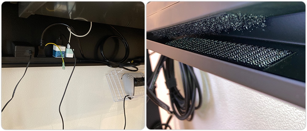 また、延長コードを机の下に設置できるスペースがあり、モニターやスマホの充電器、PCの充電コードも配線トレーにある穴から通していくことで、仕事中の配線のごちゃつきが気になりにくい点も良かったです。