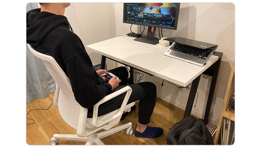 このワークスペースは趣味のゲームの時間にも活躍します。8時間の仕事から、プラス1~2時間の趣味と、長時間座った状態になりますが、全面メッシュ地のチェアなので通気性が良く蒸れる心配もありません。ゲーム用のスペースを別でこだわって作るよりも、ワークスペースとまとめてつくる方が経済的ですし、デザインもシンプルなアイテムを使った部屋のテイストとの調和を重視したりする人には非常にオススメです。