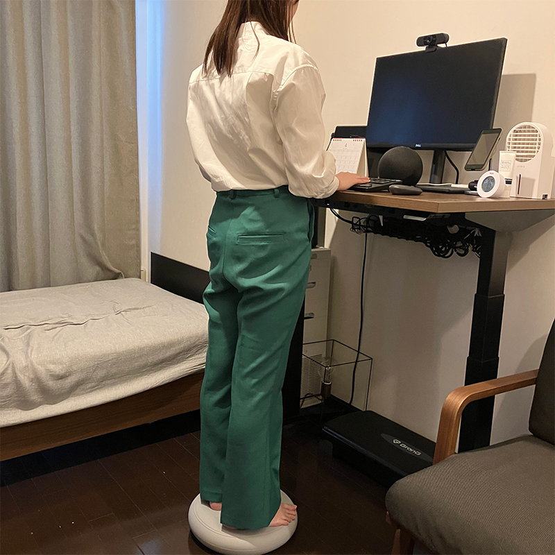 バランスディスクの上に立っています。体幹やバランス機能を高めるための道具でして、意外と効きます!立つだけでも健康的なのに、簡単に筋トレまでできるようになりました。