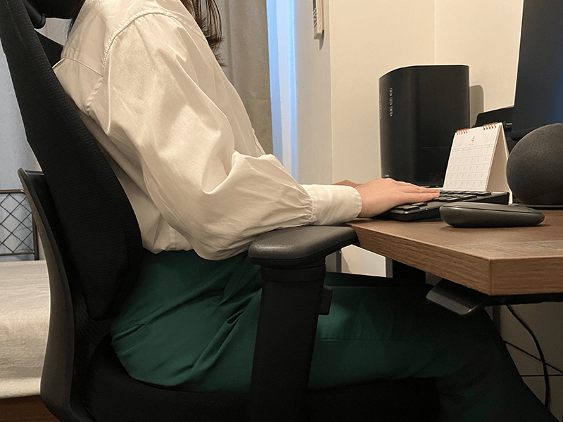 天板の高さに合わせて、椅子の座面をあげてみると、足が床につかずぷらぷら。せっかくの可動肘も随分下の方にあって「肘掛けって誰が使うの?」なんて失礼なことを考えていました。