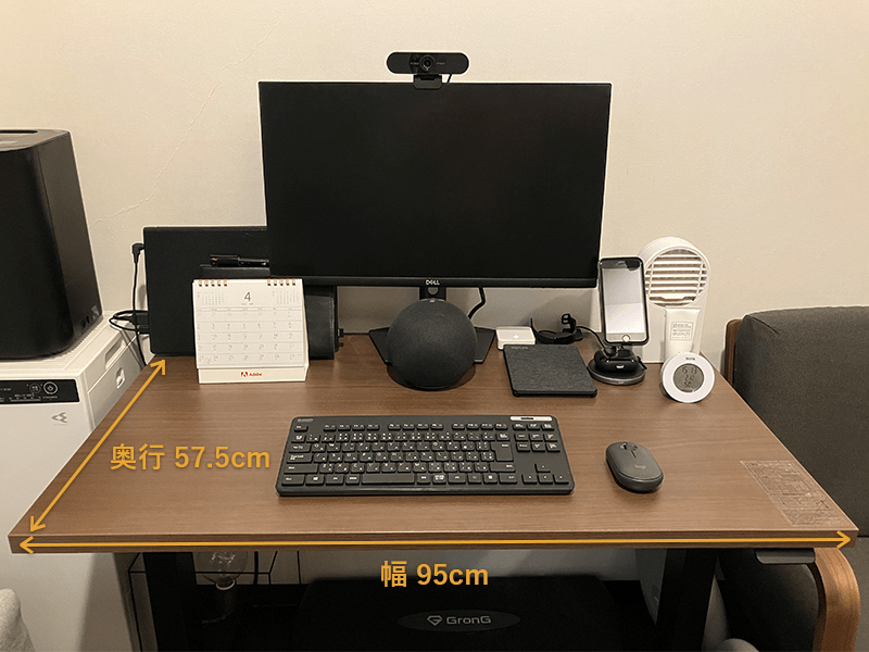 天板サイズは一番小さい幅95㎝×奥行き57.5㎝を選びました。設置スペースがソファとベッドの隙間の幅100㎝しかなかったので、横幅を基準に設置サイズの幅が100㎝(天板幅95㎝)を選びました。設置サイズの横幅が100㎝のものは、奥行きが60㎝のものしかないので、買う前は「ちょっと狭いんじゃないの~?」なんて、会社のデスクと比べてしまって心配していましたが、必要なものを乗せてみるとこんな感じ。