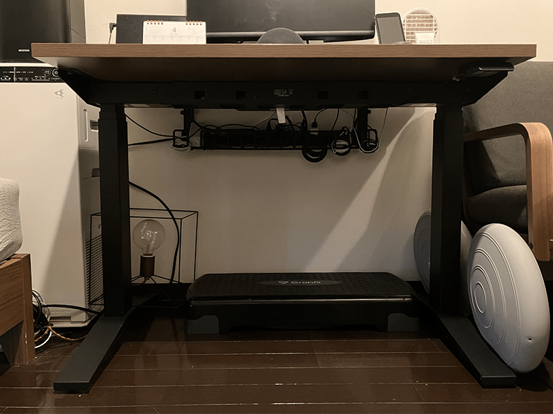 仕事が終わると天板の高さを高くして椅子をしまうので、朝は立ちながらメールチェックをして徐々に仕事スイッチをONにしていきます。