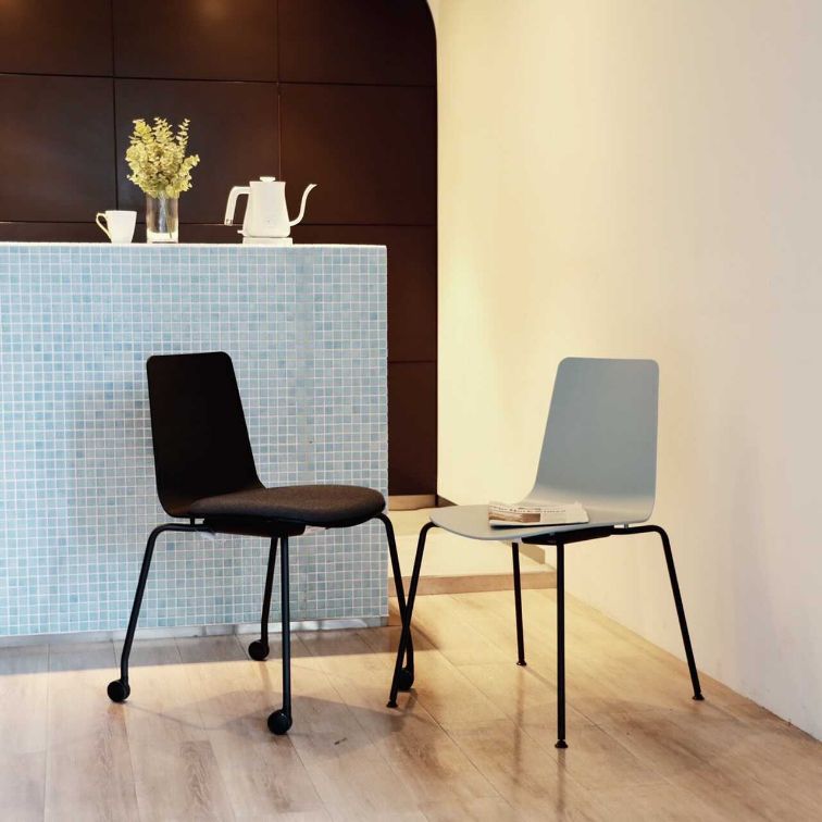パッド付きタイプや張りぐるみタイプの座には厚みのあるウレタンクッションを使用することで、ここちよく体をサポート。さらに4本脚の椅子を引く際に気になる床との「びびり音」を軽減するため、新設計の脚を採用。