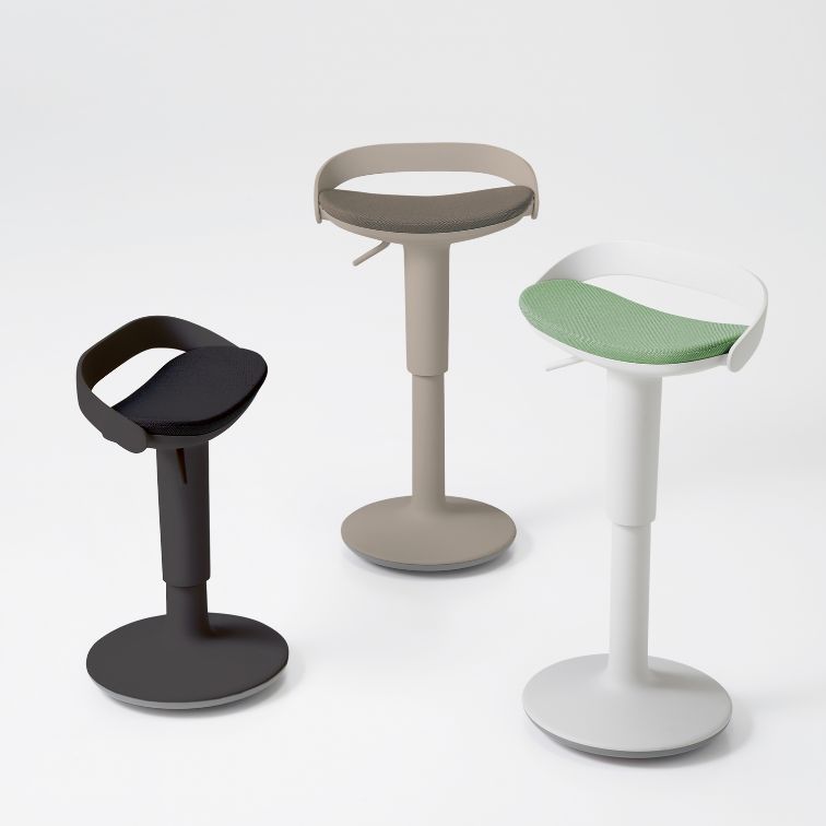 さっと立ち座りしやすいミドルハイポジションと、スツールが斜めに傾き安定する脚形状。ミドルハイポジションで揺れることで、アイデアの発想数にアプローチ。一般的なミドルハイスツールに比べ、アイデアを出しやすい状態をつくります。座面はお尻にフィットする湾曲形状が特長。腰当てとモールドウレタンクッションにより、適切に体圧を分散し、快適さが持続します。さっと持ちやすいハンドルが付いており、持ち運びやすい軽さで、シーンに合わせた移動が簡単にできます。