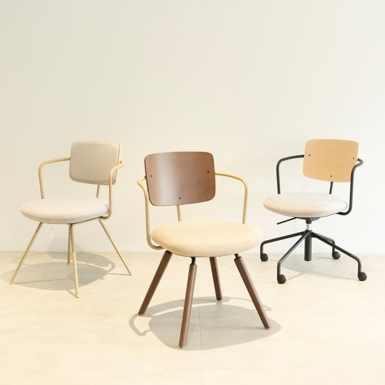 メンテナンス性に優れた樹脂シェルや木目シェル、最適な座り心地を提供するクッションなどの豊富なシートバリエーションに、キャスタータイプやハイカウンタータイプ、木脚など5種類のベースを組み合わせることで様々な空間イメージにあうチェアが選べます。カラーは落ち着きのあるニュアンスカラーを採用しました。