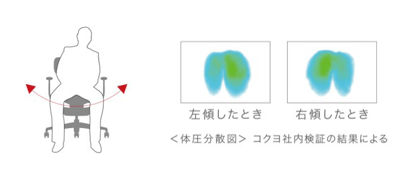 前後左右スムーズに動くメカが、座面を揺らしながら座る人の体の動きに常に追随するため、体圧が一点に集中してかかり続けることがなく、動的に体圧を分散し続けます。