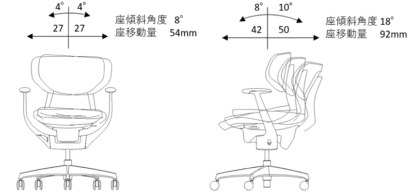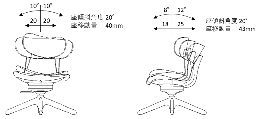 座面の前後左右の移動範囲は ing より小さいですが、傾きが ing より大きいため、動く量は ing と同程度の体感です。